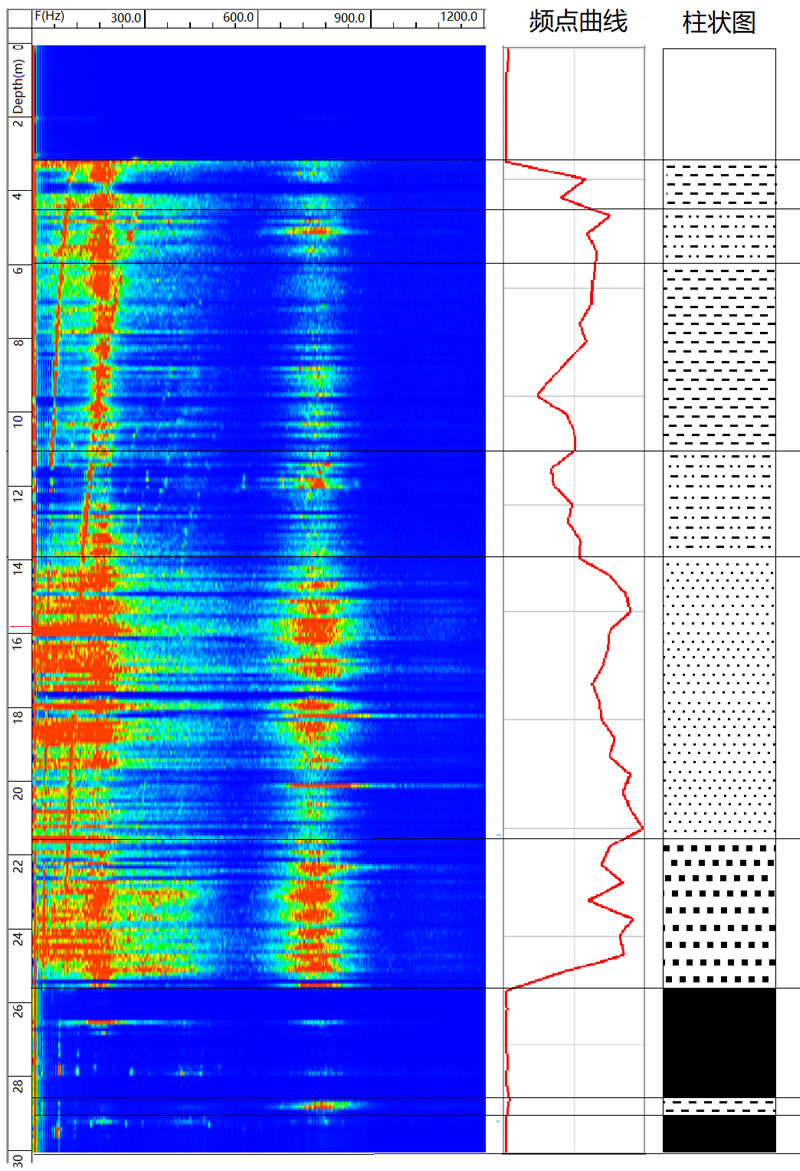 利用近源三分量傳感器采集破巖地震記錄,經(jīng)波譜分析,其低頻譜為轉(zhuǎn)速、鉆桿擺動(dòng)等,其高頻譜與巖性對(duì)應(yīng),將高頻進(jìn)行曲線歸一化,獲得鉆進(jìn)巖性分層信息。