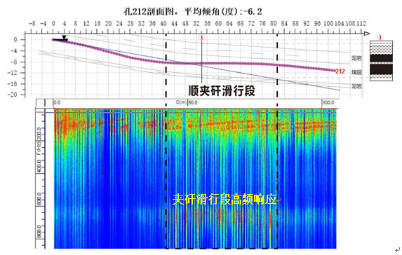 順層孔隨鉆測(cè)震,一般為低頻響應(yīng),若遇煤層夾矸,則產(chǎn)生順夾矸滑行現(xiàn)象,且通過高頻段頻譜響應(yīng),可判斷順夾矸滑行距離。