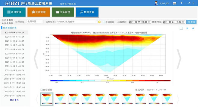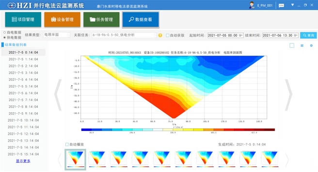 監(jiān)測(cè)系統(tǒng)硬件采用模塊集成的數(shù)據(jù)采集機(jī)箱及傳感器線纜組成�,F(xiàn)場(chǎng)安裝方便,只需將線纜埋入工程巖土體表面或內(nèi)部并連接采集機(jī)箱,數(shù)據(jù)采用4G/5G模塊或者光纖進(jìn)行傳輸。系統(tǒng)根據(jù)軟件設(shè)定的參數(shù)進(jìn)行數(shù)據(jù)采集,采集的電性參數(shù)豐富,數(shù)據(jù)自動(dòng)上傳云端進(jìn)行自動(dòng)化處理,并對(duì)處理結(jié)果進(jìn)行計(jì)算比對(duì)成圖,在數(shù)據(jù)異常時(shí)及時(shí)報(bào)警。
