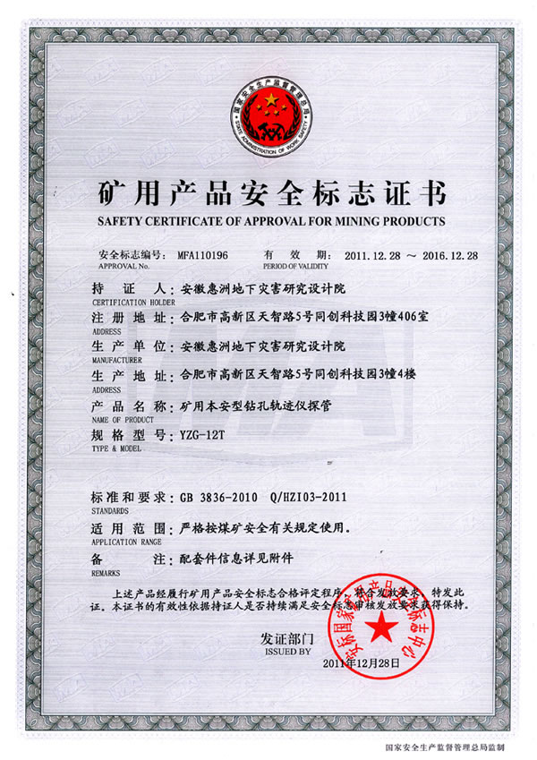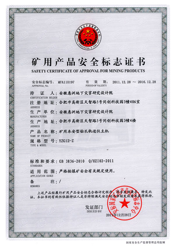 在院長室的堅強領導下,在各部門的大力配合支持下,經研發(fā)中心硬件部全體員工的不懈努力,精心設計研制的YZG12型礦用鉆孔軌跡儀,嚴格按安標國家礦用產品安全標志中心的煤安資格要求,制訂了健全的質量管理體系;技術文件與安標國家中心審查確認的一致,作業(yè)指導文件齊全;生產設備、檢驗儀器設備完善;檢驗人員對儀器、設備操作較為熟練,標準掌握程度為熟悉;整體生產條件和質量管理體系符合相關評審準則的要求,具備生產能力;己于2011年12月28日獲得安標國家礦用產品安全標志中心標志證書。