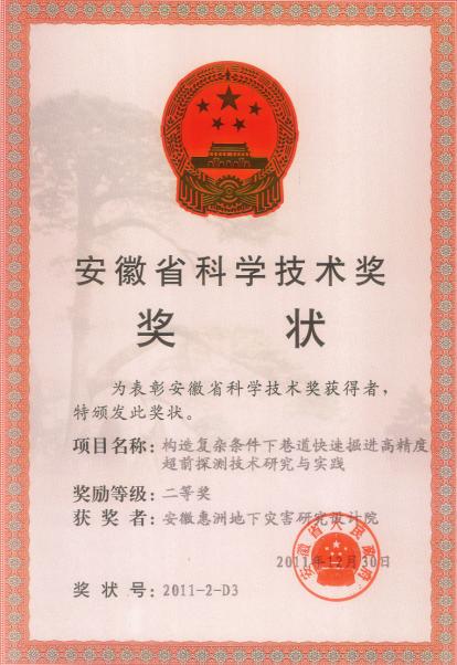 熱烈祝賀我院《構(gòu)造復(fù)雜條件下巷道快速掘進(jìn)高精度超前探測(cè)技術(shù)研究與實(shí)踐》項(xiàng)目獲得2011年度安徽省人民政府頒發(fā)的安徽省科學(xué)技術(shù)二等獎(jiǎng)。