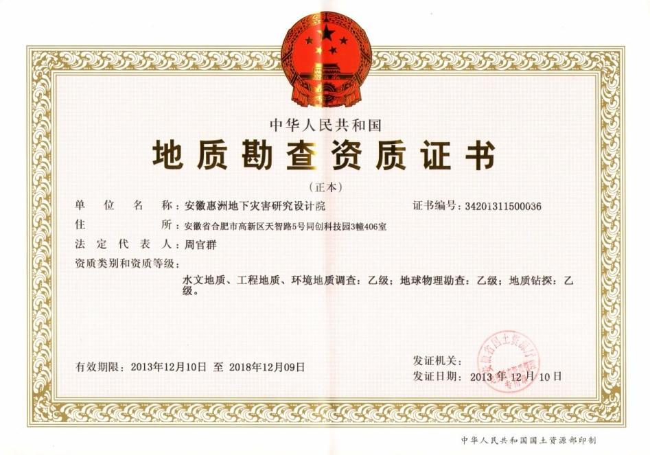 惠洲院的地質(zhì)勘查資質(zhì)的地球物理勘查資質(zhì)升級(jí)至乙級(jí),至此我院的水文地質(zhì)、工程地質(zhì)、環(huán)境地質(zhì)調(diào)查、地質(zhì)鉆探、地球物理勘查三項(xiàng)地質(zhì)勘查資質(zhì)均為乙級(jí)。