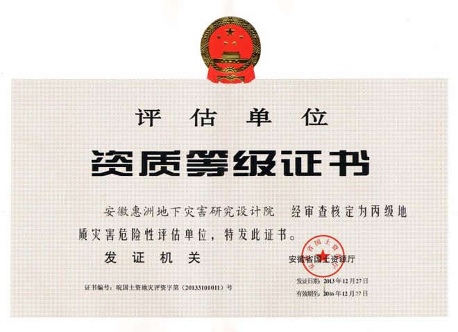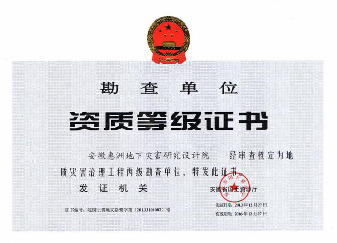 熱烈祝賀我院榮獲通過(guò)了地質(zhì)災(zāi)害危險(xiǎn)性評(píng)估單位和地質(zhì)災(zāi)害治理工程勘查單位2項(xiàng)丙級(jí)資質(zhì)。