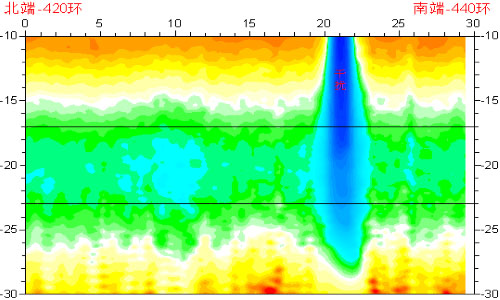 整個鉆孔在水平上稍有擺動。在26m深時,擺動量最大約20cm,垂直方向在46米位置,最大擺動量約14cm,在46米位置開始上擺,在57米時最大擺動量約23.5cm。