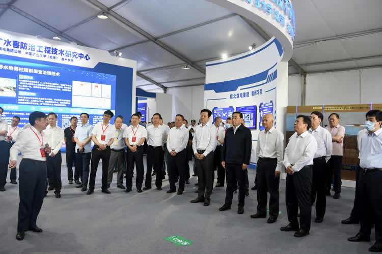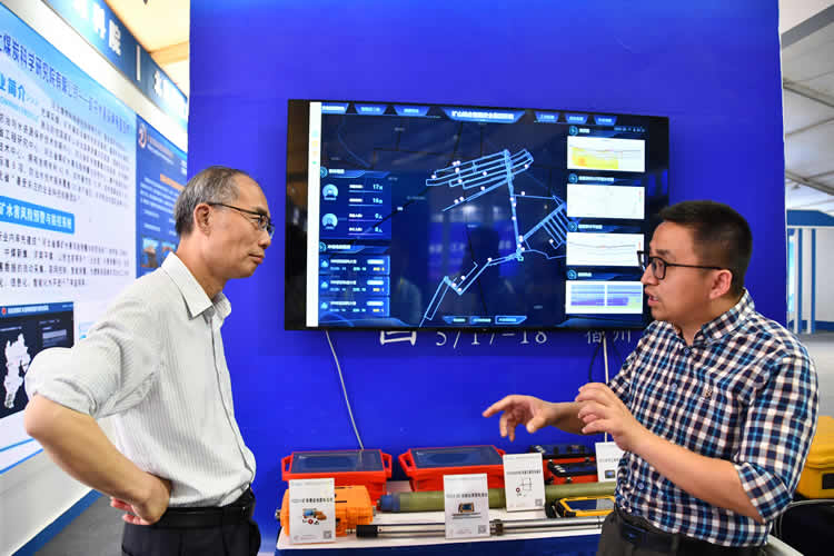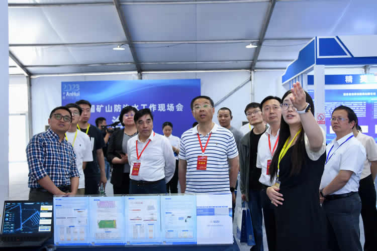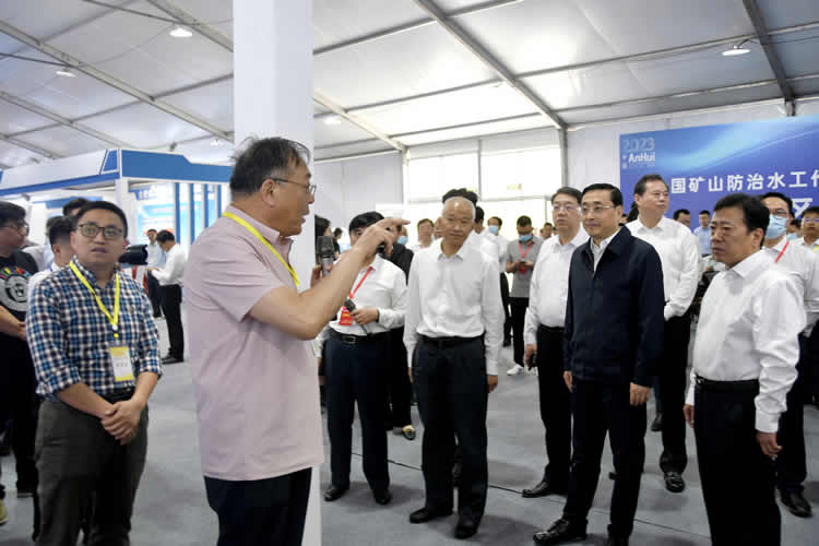 ▲國家礦山安全監(jiān)察局黃錦生書記、安徽省常務(wù)副省長費高云蒞臨展位聽取惠洲院技術(shù)與產(chǎn)品匯報
