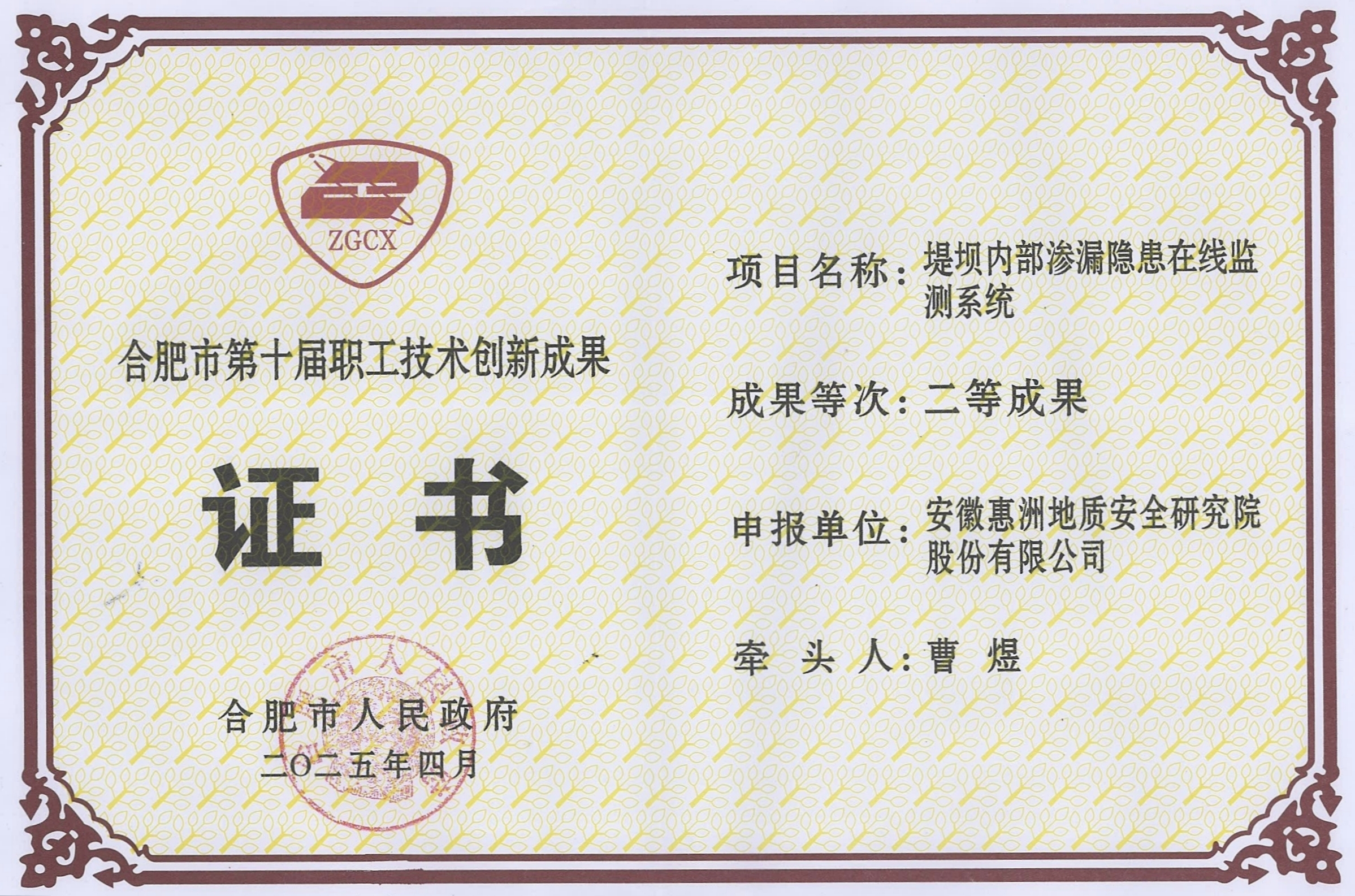 4月30日,合肥市第十屆職工技術(shù)創(chuàng)新成果評(píng)選結(jié)果正式揭曉,惠洲院總工程師曹煜牽頭的“堤壩內(nèi)部滲漏隱患在線監(jiān)測系統(tǒng)”項(xiàng)目榮獲合肥市第十屆職工技術(shù)創(chuàng)新成果二等獎(jiǎng)。